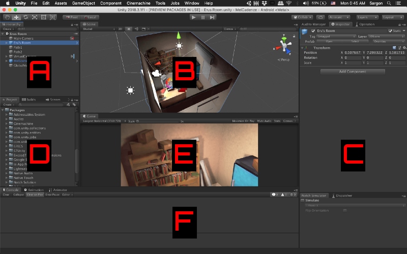 D: File Hierarchy | E: Game Display (Camera) | F: Console Log